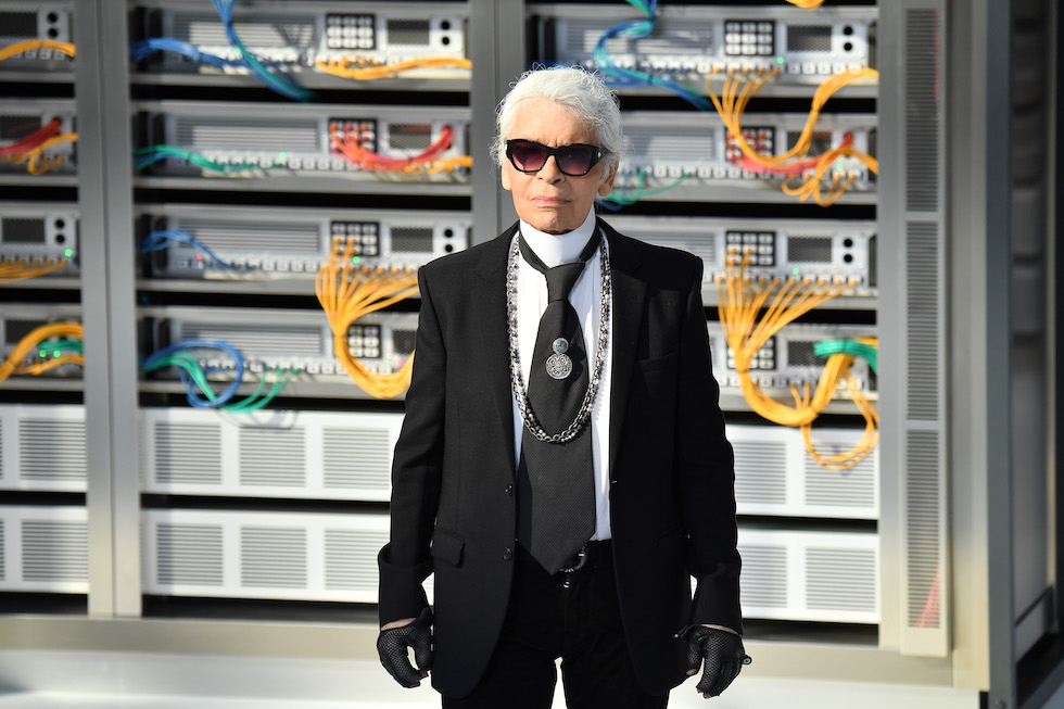 Per Lagerfeld invece date un’occhiata a queste foto, in particolare a quella qui sotto, scattata a una sfilata di Chanel a novembre 2016. Per riprodurla serve un completo nero elegante con una camicia bianca (meglio se con un colletto un po’ importante che potete replicare con un cartoncino bianco, se serve), una cravatta nera un po’ larga, un paio di occhiali scuri e dei guanti di pelle neri senza dita, come quelli da moto (meglio se con i buchi sulle nocche). Se volete essere accurati potete aggiungere anche una catena e una spilla per la cravatta.