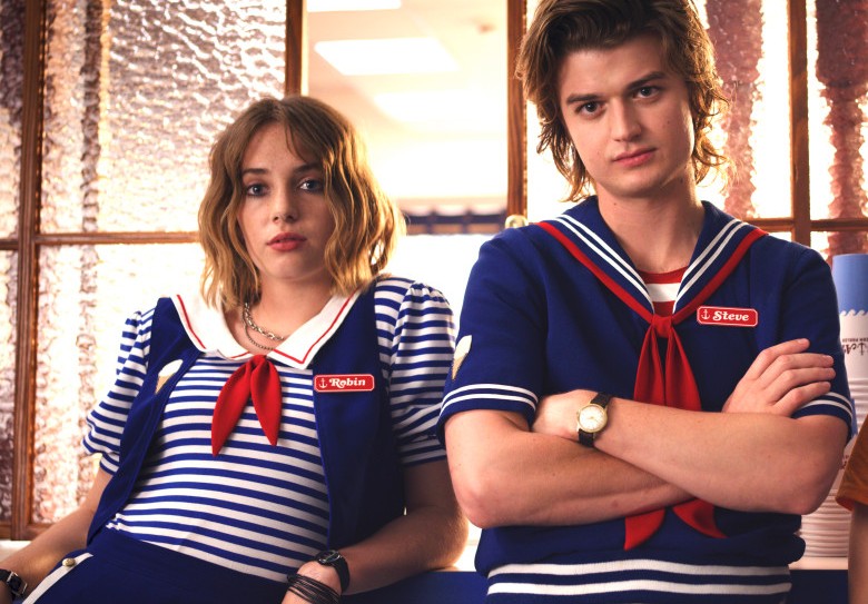 Nell’ultima stagione, Steve lavora nella gelateria di un centro commerciale dove conosce Robin (interpretata dall’attrice Maya Hawke, figlia di Uma Thurman e Ethan Hawke). Per riprodurre la loro divisa da lavoro procuratevi un paio di pantaloni e una gonna blu, una maglietta a righe rosse e bianche o blu e bianche e due cappellini bianchi da marinaio. Qui trovate un kit di cappellino e sciarpetta da marinaio, ma se avete tempo di cercarli, potreste trovarli nei negozi di cose vintage.