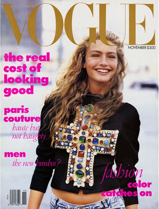 La copertina del suo primo numero, uscito a novembre, fu rivoluzionaria e sconcertante. Raffigurava una modella sconosciuta, la 19enne Michaela Bercu, fotografata da Peter Lindbergh e vestita con una giacca con una croce di gioielli di Christian Lacroix che costava 10mila dollari su un paio di jeans di Guess da 50. Bercu sorrideva spettinata, con gli occhi chiusi e la pancia sporgente, i jeans furono una trovata dell’ultimo minuto perché Bercu era ingrassata in vacanza e non entrava nella gonna che era stata scelta prima: gli stampatori chiesero se fosse un errore – in copertina all’epoca c’erano ragazze ingessate, scatti in studio e vestiti da sera – il pubblico pensò che la modella fosse incinta, ma niente di tutto questo era vero: «semplicemente appena vidi la foto sentii il vento del cambiamento», spiegò anni dopo Wintour.