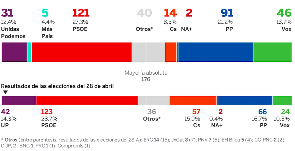 Secondo gli ultimi sondaggi realizzati dall’istituto 40db e commissionati e pubblicati dal País, anche le prossime elezioni potrebbero risultare in un parlamento diviso, in cui né il blocco delle sinistre né quello delle destre arriverebbe ai 176 seggi necessari per avere la maggioranza in parlamento. Tutti gli altri sondaggi realizzati negli ultimi giorni, come quello pubblicato sul Diario, hanno mostrato risultati simili, con una rilevante eccezione: l’ultimo sondaggio realizzato dal Centro di Ricerche sociologiche (CIS), che ha attribuito molti più seggi degli altri ai Socialisti.