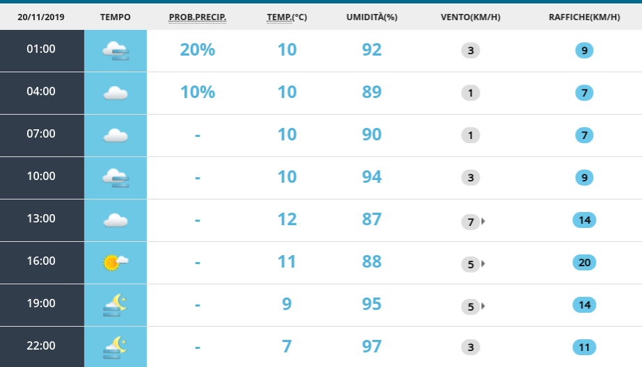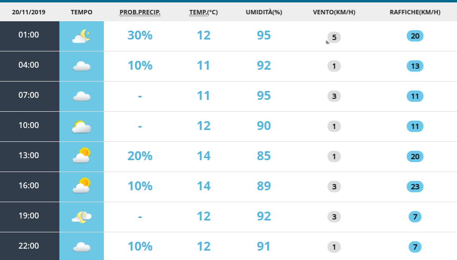 Mercoledì mattina dovrebbe piovere sulla costa adriatica, a Venezia (ma poi dovrebbe smettere dopo poco) e in provincia di Imperia. Di pomeriggio ci saranno schiarite e potrebbe piovere solamente in Umbria, in provincia di Viterbo, in provincia di Catanzaro e di nuovo nella zona di Imperia. Di sera continuerà a piovere in Umbria e peggiorerà in Friuli Venezia Giulia, mentre di notte è prevista pioggia sulla costa ligure e in provincia di Pisa.