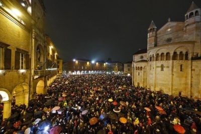 Lunedì 18 novembre a Modena almeno 7 mila persone hanno protestato in Piazza Grande contro l’evento elettorale tenuto in città dal leader della Lega Matteo Salvini a sostegno di Lucia Borgonzoni, candidata del centrodestra a presidente dell’Emilia-Romagna per le elezioni regionali del 26 gennaio 2020. La manifestazione di Modena, come quella di giovedì 14 novembre a Bologna, è stata organizzata in forma di flash mob. Nonostante la pioggia in piazza c’erano migliaia di persone “strette come sardine” – come da slogan dei promotori – a cantare “Bella ciao” o slogan come “Modena non si Lega”. I manifestanti si sono radunati poco prima delle 19, occupando non solo la piazza ma anche le traverse adiacenti e i portici.