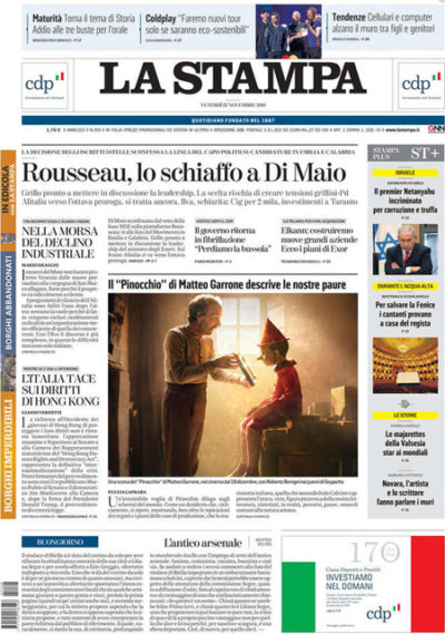 Su tutti i giornali di oggi l’apertura è dedicata al voto degli iscritti alla piattaforma Rousseau con il quale è stato deciso che il Movimento 5 Stelle si presenti da solo alle prossime elezioni regionali in Calabria e Emilia-Romagna, notizia interpretata dai giornali come una bocciatura della leadership di Luigi Di Maio che si era espresso contro la partecipazione. Libero continua a criticare il movimento delle “sardine”, Avvenire apre su un nuovo naufragio di migranti nel Mediterraneo, e i giornali economici aprono sulla riduzione del rating delle banche tedesche da parte dell’agenzia Moody’s.