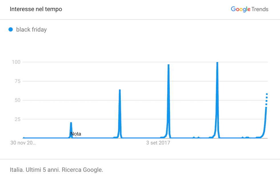 12.45 – Se cercate “Black Friday” su Google Trends vi accorgete subito di come in Italia, negli ultimi cinque anni, sia cresciuto l’interesse per questa ricorrenza commerciale. C’è stata una grande crescita delle ricerche soprattutto dal 2015 al 2016 e poi dal 2016 al 2017, mentre dal 2017 al 2018 la crescita è stata più limitata, forse perché a quel punto ormai tutti ne avevano sentito parlare almeno una volta. È troppo presto per fare previsioni su quest’anno, ma visto da qui è abbastanza sorprendente pensare che fino al 2014 di Black Friday non si parlava per niente.