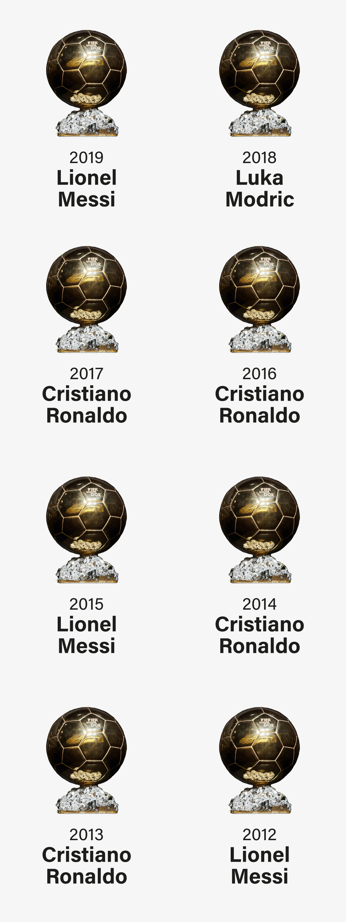 Il Pallone d’Oro si assegna dal 1956, anno in cui la rivista France Football istituì un premio da dare al miglior calciatore dell’anno: da allora, per storia e prestigio si è affermato come il premio individuale più ambito. Il penultimo assegnato, vinto nel 2018 dal centrocampista croato del Real Madrid Luka Modric, aveva interrotto il decennio in cui a dividerselo erano stati proprio Messi e l’attaccante portoghese della Juventus (ex Real Madrid) Cristiano Ronaldo.