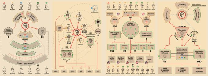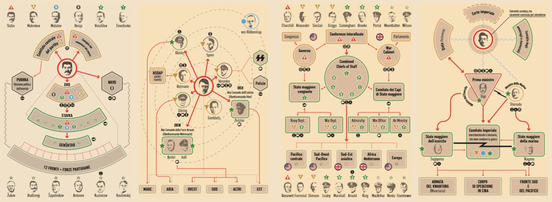 Questa infografica permette di cogliere un’altra caratteristica che giocò a favore degli Alleati: la catena di comando. Quella anglo-americana era semplice ed efficiente: i governi prendevano le decisioni ai loro massimi livelli e poi passavano le loro istruzioni generali al “Combined chiefs of staff”, dove sedevano i più alti ufficiali delle due nazioni. Questa struttura esercitava poi il comando sui vari contesti, i cui comandanti avevano ampia libertà di organizzarsi. L’alto comando tedesco, a confronto, è un rebus, frutto del tipico modo di governare di Hitler: creare una grande confusione di ruoli e incarichi sovrapposti così che tutti fossero in perenne gara per ottenere il suo favore. L’alto comando sovietico in parte soffriva dello stesso problema, ma Stalin diede prova di saper correggere i suoi errori molto in fretta. Dopo il primo anno di guerra, l’alto comando era divenuto una struttura centralizzata ed efficiente. L’alto comando giapponese, infine, soffriva di frammentazione (diviso com’era tra la marina e l’esercito che si odiavano reciprocamente) e dalla mancanza di una chiara autorità centrale.