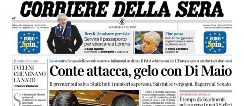 Tutti i giornali di oggi si occupano in apertura del dibattito parlamentare sul MES, il Meccanismo Europeo di Stabilità, durante il quale il presidente del Consiglio Conte ha spiegato tutti i passaggi della discussione sulla norma che ha lo scopo di aiutare i paesi dell’Unione Europea in difficoltà economica, e ha attaccato i ministri del suo precedente governo sostenendo che ne erano stati informati e non avevano mai obiettato. Fanno eccezione Avvenire e il Manifesto, che si occupano dell’apertura della conferenza sul clima a Madrid con l’intervento del segretario generale dell’ONU Guterres.