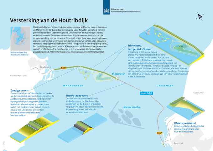La strada che mette in comunicazione i due estremi dell’insenatura, passando sopra la Houtribdijk, è lunga circa 25 chilometri. La diga fu costruita nei primi anni Sessanta, nell’ambito di un più ampio progetto di messa in sicurezza del territorio, dopo anni di inondazioni che avevano causato la morte di almeno 1.800 persone. La Houtribdijk impedisce il moto ondoso dal lago artificiale IJsselmeer, uno dei più grandi di Europa ma profondo appena 5 metri, al Markermeer, altro lago artificiale formato in seguito alla costruzione della diga.