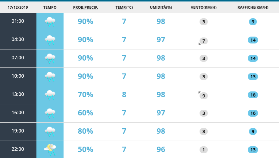 La scorsa settimana c’è stato un assaggio di clima natalizio con un po’ di neve nelle regioni del Nord, ma ora che stiamo entrando nell’ultima settimana prima di Natale è prevista solo noiosa e fastidiosa pioggia. Ce ne sarà molta soprattutto al Nord, martedì, in tutte le regioni a eccezione dell’Emilia-Romagna. Nel pomeriggio continuerà così e potrebbe peggiorare anche a Piacenza, mentre nel resto d’Italia sarà più o meno soleggiato o poco nuvoloso. Di sera e di notte non ci saranno ulteriori variazioni, a parte una leggera schiarita al Nord-Est.