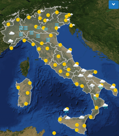 A differenza degli ultimi giorni, lunedì sarà bello praticamente ovunque al Nord e al Centro, con l’eccezione di sacche di nebbia nella pianura padana. Al Sud si registrano invece nuvole e piogge, e sopra i 400-500 metri ci sarà la neve. La situazione migliorerà nel pomeriggio.