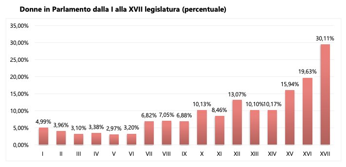 Per quanto riguarda la rappresentatività, le “quote rosa” previste dalla legge elettorale italiana del 2017 hanno prodotto il numero di donne più alto mai registrato in Parlamento: nei giorni dell’insediamento della nuova legislatura erano 334, il 35 per cento del totale, contro le 299 della legislatura precedente. Nella legislatura precedente era stata eletta in Parlamento una donna ogni 103mila abitanti donne; in quella attuale il rapporto è diminuito a una ogni 93mila (rapporto per gli uomini: uno a 42mila abitanti uomini nella scorsa legislatura, uno a 48mila in quella attuale).