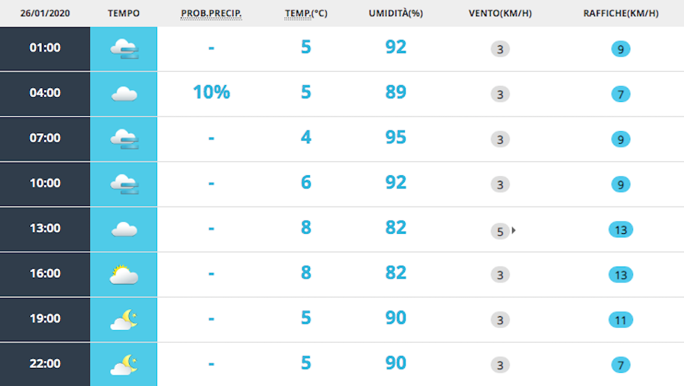 Nuvole e nebbia al mattino e qualche schiarita al pomeriggio, con temperature tra i 5 e gli 8 gradi.