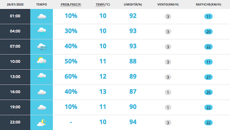 Pioggia. Poi un po’ meno pioggia, poi nuovamente pioggia poi solo nuvole. Temperature tra i 10 e i 13 gradi ma tanto starete in casa per colpa della pioggia.
