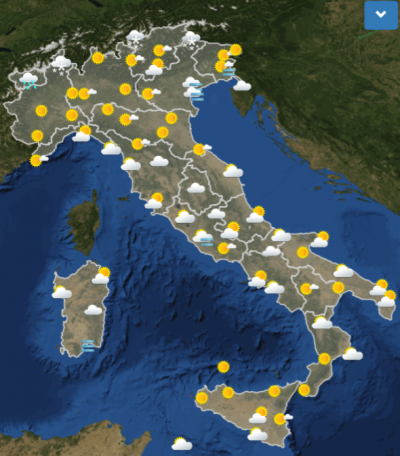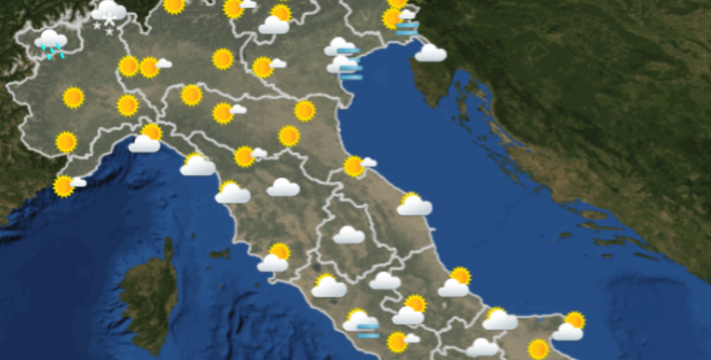 Le previsioni meteo per la giornata di mercoledì dicono che sarà una giornata tutto sommato buona, con sole in molte regioni e qualche nuvola passeggera. Ci sarà pioggia solamente in Valle d’Aosta, di mattina, ed è prevista neve nel bellunese e nel verbanese. Di pomeriggio sarà soleggiato al Nord e al Sud, mentre al Centro sarà nuvoloso. Di sera e di notte la situazione rimarrà stabile, con probabili peggioramenti solamente nella zona di Messina.