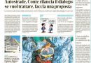 La maggior parte dei giornali di oggi si occupa ancora in apertura dello stato di salute della maggioranza, con le ipotesi più disparate sul futuro del governo dopo le tensioni con Italia Viva degli ultimi giorni. Altri giornali titolano invece sull’attentato razzista di Hanau, in Germania, dove un uomo che voleva colpire gli stranieri ha ucciso dieci persone prima di suicidarsi, il Secolo XIX e il Gazzettino aprono sulle discussioni sulla concessione alla società Autostrade, mentre i giornali sportivi commentano le vittorie di Inter e Roma nell’andata dei sedicesimi di finale di Europa League.