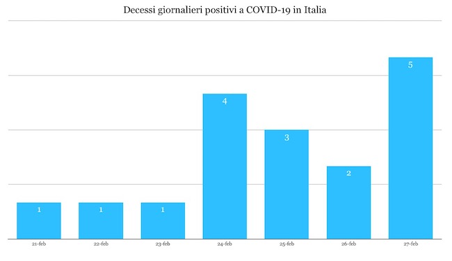 Il grafico qui sotto mostra il progressivo aumento dei casi positivi registrati in Italia dal 20 al 27 febbraio e non comprende quindi i nuovi dati comunicati nel tardo pomeriggio del 28 febbraio (li trovate qui).
