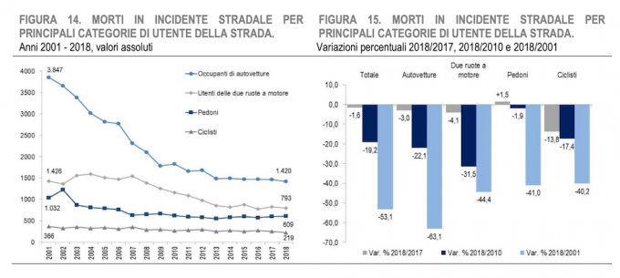 Considerando tutte le morti avvenute negli incidenti stradali, quelle dei pedoni nel 2009 rappresentavano il 12 per cento del totale, mentre nel 2018 sono arrivate al 17 per cento: per la prima volta dal 1982 i pedoni sono diventati la categoria più numerosa tra le persone morte negli incidenti stradali, più di automobilisti, motociclisti e ciclisti. Secondo il rapporto, in questo dato va considerato anche il fatto che le automobili negli ultimi anni sono diventate sempre più sicure, grazie anche a nuovi sistemi di sicurezza, come la frenata assistita, un fattore che ha fatto diminuire il numero di automobilisti morti.