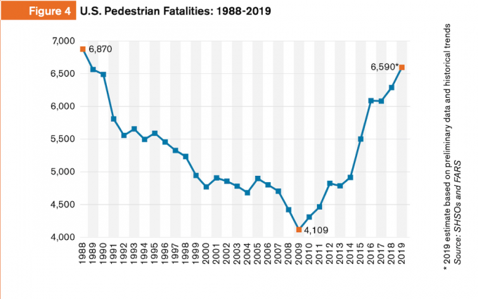 La Governors Highway Safety Association (GHSA), un’associazione che raggruppa le persone che si occupano di sicurezza stradale in tutti gli stati degli Stati Uniti, ha pubblicato un nuovo rapporto sull’andamento degli incidenti mortali avvenuti nel paese nell’ultimo anno: sulla base dei dati dei primi sei mesi del 2019, il rapporto stima che durante tutto l’anno siano morti 6.590 pedoni, una cifra in crescita del 5 per cento rispetto al 2017 e di ben il 50 per cento rispetto al 2009, quando era stato toccato il minimo di 4.109 pedoni morti.