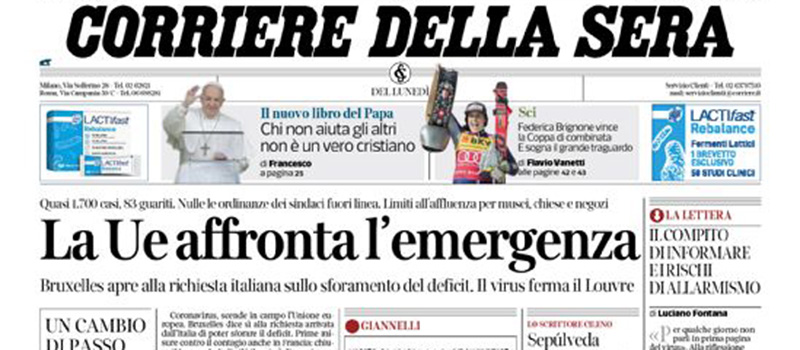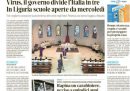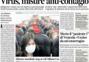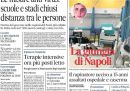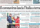 Le notizie sulla diffusione del coronavirus (SARS-CoV-2) sono in apertura su tutti i giornali di oggi, che titolano sul decreto del governo per contrastare l’epidemia che divide l’Italia in tre zone, sull’aumento del numero dei contagiati, sulla richiesta all’Unione Europea di poter superare i limiti sul deficit, e sulla decisione di alcune compagnie aeree di bloccare i voli da e verso l’Italia, mentre i giornali sportivi aprono sulle polemiche nel calcio dopo la decisione di rinviare le partite che si sarebbero dovute giocare a porte chiuse in questo fine settimana.