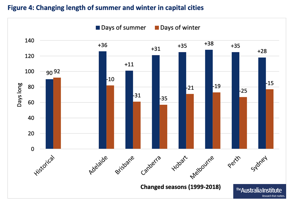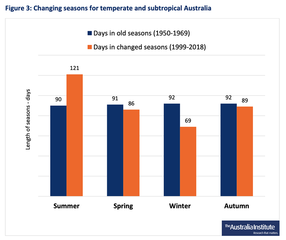 L’Australia Institute ha confrontato i dati del Bureau of Meteorology (BoM, l’Ufficio di meteorologia) degli ultimi vent’anni con quelli che vanno dal 1950 al 1969. I risultati dicono che, in media, le temperature estive tra il 1998 e il 2018 sono state di circa trentuno giorni più lunghe rispetto a quelle degli anni Cinquanta. Man mano che le estati si sono allungate, la durata delle temperature invernali si è accorciata. Rispetto alla metà del Ventesimo secolo, dunque, gli inverni si sono ridotti di circa ventitré giorni. Tra il 2014 e il 2018 il fenomeno è cresciuto al punto che le estati sono diventate due volte più lunghe degli inverni.