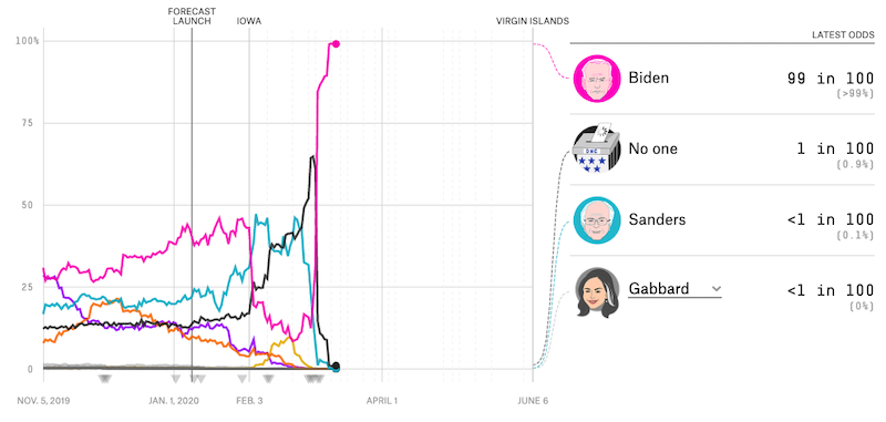 I ribaltamenti delle ultime settimane e la poca distanza fra Biden e Sanders potrebbe far pensare che la corsa sia ancora piuttosto aperta. Non è così: Joe Biden è ormai il nettissimo favorito, tanto che il sito FiveThirtyEight stima che abbia 99 probabilità su 100 di ottenere la nomination, mentre diversi funzionari e politici del Partito Democratico stanno consigliando piuttosto apertamente a Sanders di ritirarsi e appoggiare Biden.
