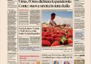 Tutti i giornali di oggi titolano in apertura sul nuovo decreto per contrastare la diffusione del coronavirus (SARS-CoV-2), annunciato ieri sera dal presidente del Consiglio Conte con un messaggio televisivo, che prevede la chiusura in tutta Italia per due settimane di locali e negozi con l’eccezione di alimentari, farmacie e altre attività considerate essenziali. A questa notizia molti associano la decisione del governo su un provvedimento di aiuti economici per 25 miliardi di euro per le conseguenze dell’epidemia e la dichiarazione della pandemia per il coronavirus da parte dell’Organizzazione Mondiale della Sanità.