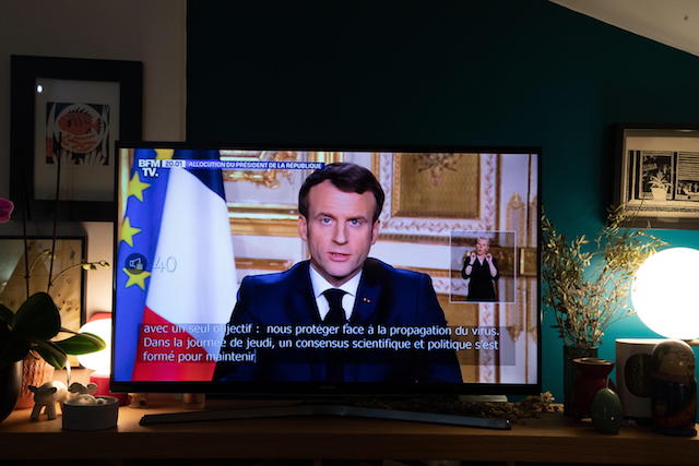 Sempre nella serata di lunedì, ha parlato anche Emmanuel Macron. In un discorso alla nazione fatto dal suo ufficio e in cui le parole «siamo in guerra» sono state ripetute più volte, il presidente francese ha annunciato misure drastiche, superiori a quelle di Germania, Regno Unito e Stati Uniti e in gran parte simili a quelle annunciate una settimana fa dal presidente del Consiglio italiano Giuseppe Conte. Macron ha annunciato che da mezzogiorno di domani e per almeno 15 giorni sarà necessario evitare assembramenti e limitare al minimo gli spostamenti personali. Ha annunciato, inoltre, che sono sospese tutte le riforme attualmente in discussione nel paese e che sarà posticipato il secondo turno delle elezioni municipali.