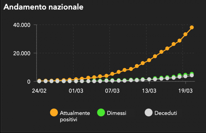 Secondo i dati diffusi venerdì dalla Protezione Civile, le persone che in Italia sono risultate positive al test per il coronavirus (SARS-CoV-2) dall’inizio dell’epidemia sono in tutto 47.021 (5.986 in più rispetto a ieri): il dato sui contagi totali comprende sia le persone morte (4.032, 627 in più rispetto a ieri), che quelle “guarite” (5.129, 689 in più rispetto a ieri). Le persone attualmente positive sono 37.860, 4.670 in più rispetto a ieri.