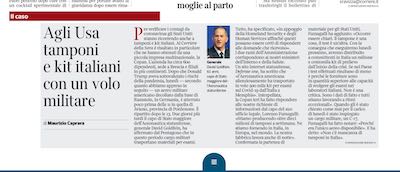 L’articolo parlava di Copan, un’azienda di Brescia che aveva fornito i tamponi, trasportati poi da un aereo militare dalla base di Aviano (Pordenone) verso gli Stati Uniti. Il testo era stato modificato nel pomeriggio di giovedì 19 marzo per aggiungere alcune dichiarazioni dell’azienda coinvolta (la versione originale non è più reperibile ed è stata rimossa dalla cache di Google). L’articolo modificato è stato poi pubblicato sul quotidiano di oggi con il titolo: “Agli USA tamponi e kit italiani con un volo militare”. (Venerdì Martina Pennisi del Corriere ha pubblicato su Twitter una spiegazione delle scelte del giornale sulla prima pubblicazione e seguente modifica dell’articolo.)