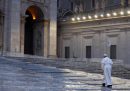 Nella sera di venerdì, papa Francesco ha tenuto un momento di preghiera e un breve discorso da solo, davanti al cancello centrale della basilica di San Pietro, di fronte a piazza San Pietro, completamente deserta a causa delle restrizioni per l’epidemia da coronavirus.