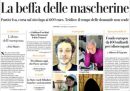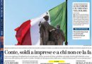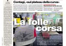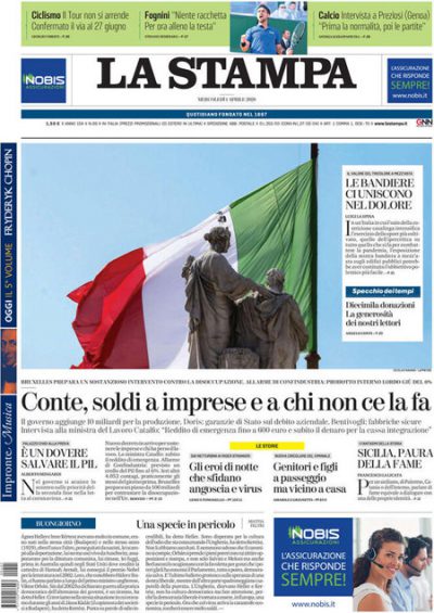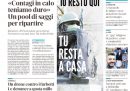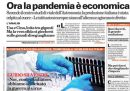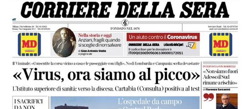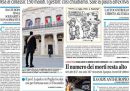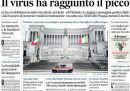 Le notizie principali sul coronavirus (SARS-CoV-2) di cui si occupano i giornali di oggi sono il numero dei contagiati rilevati in Italia, che mantiene l’andamento degli ultimi giorni, e la valutazione dell’Istituto Superiore di Sanità sul raggiungimento del picco dell’epidemia, le nuove misure di sostegno all’economia allo studio del governo, le previsioni di Confindustria sugli effetti del virus sul PIL, la circolare del ministero dell’Interno che consente brevi passeggiate con i figli minori e con gli anziani criticata dai presidenti di alcune regioni, e i problemi nella distribuzione dei dispositivi di protezione.