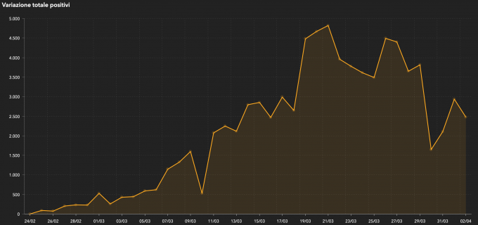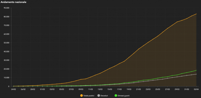 Secondo i dati diffusi giovedì dalla Protezione Civile, i contagi totali registrati ufficialmente dall’inizio dell’epidemia di COVID-19 in Italia sono stati 115.242: 4.668 in più rispetto a ieri, quando erano aumentati di 4.782. Le morti registrate oggi sono state 760 (ieri erano state 727), portando il totale a 13.915. I nuovi pazienti “guariti o dimessi” registrati sono 1.431 per un totale di 18.278. Le persone attualmente positive sono 83.049 (ieri erano 80.572) e quelle ricoverate in terapia intensiva sono 4.053, 18 più di ieri che erano 4.035.