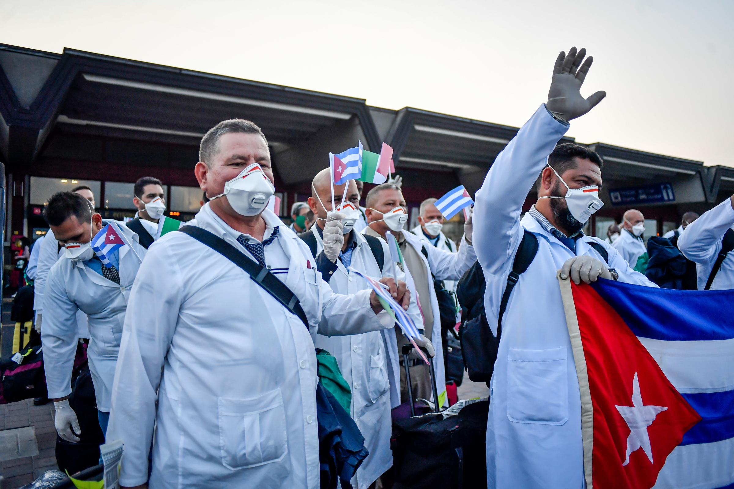 Delegazione di medici cubani inviati in Italia al momento del loro arrivo a Varese, in Lombardia, per aiutare gli ospedali della regione ad affrontare l’epidemia da coronavirus (Claudio Furlan/LaPresse)