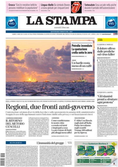 Le principali notizie sul coronavirus (SARS-CoV-2) in apertura sui giornali di oggi sono i dati comunicati ieri dalla Protezione Civile, che per la prima volta registrano una riduzione del numero delle persone attualmente positive, il crollo della quotazione del petrolio WTI sui mercati internazionali, i dubbi dei partiti sulla app Immuni che dovrebbe servire a tracciare i movimenti delle persone e i contatti con chi è stato contagiato dal virus, le solite ipotesi sulle date e le modalità della rimozione delle restrizioni, il rinvio all’autunno delle elezioni amministrative previste per questa primavera, e la discussione nella maggioranza sulla posizione da adottare nel Consiglio Europeo di giovedì sugli aiuti economici per contrastare l’epidemia.