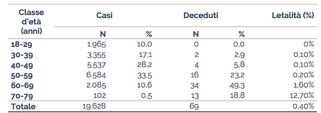La COVID-19 si rivela letale soprattutto per le persone tra gli 80 e gli 89 anni con un tasso di letalità del 30,8 per cento, seguito dal 26,1 per cento dei più anziani di 90 anni e dal 24,9 per cento di chi ha un’età compresa tra 70 e 79 anni. Nelle ultime settimane si è assistito a un aumento dei casi positivi tra le donne, ma la prevalenza dei decessi riguarda comunque gli uomini. Per i soggetti di sesso femminile il dato totale è del 9,3 per cento contro il 17,1 per cento per quelli di sesso maschile.