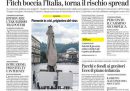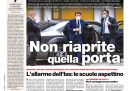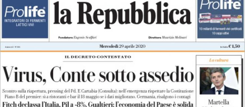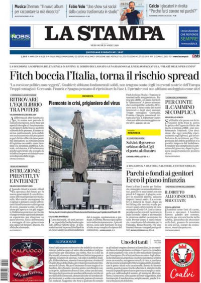 Sulla maggior parte dei giornali di oggi l’apertura è dedicata ancora alle proteste da parte di alcune regioni e di alcune categorie per la prudenza considerata eccessiva del decreto per il passaggio alla “fase 2” della gestione dell’emergenza per l’epidemia da coronavirus (SARS-CoV-2); vengono anche messe a confronto le decisioni di altri paesi europei sulla rimozione delle limitazioni e sulle possibili conseguenze. La Stampa titola invece sulla decisione dell’agenzia Fitch di abbassare il rating dell’Italia a BBB-, mentre il Secolo XIX segue il completamento dei lavori per la struttura del nuovo ponte di Genova.