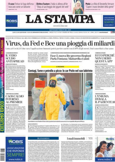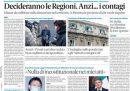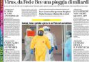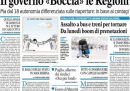 La maggior parte dei giornali di oggi titola in apertura sulle posizioni di diverse regioni che sono intenzionate a modificare, anticipandole, le indicazioni del governo rispetto al passaggio alla “fase 2” e alla riapertura di esercizi commerciali e attività produttive. La Stampa apre invece sulle mosse della Banca Centrale Europea e della Federal Reserve degli Stati Uniti per sostenere l’economia, il Corriere della Sera e il Giorno si occupano del decreto sulla app per il tracciamento dei contratti approvato ieri dal Consiglio dei ministri, e i giornali sportivi seguono le notizie sulla ripresa del campionato di serie A.