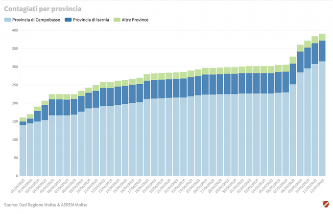 Attualmente in Molise – i dati sono di martedì 12 maggio – i contagi totali da coronavirus registrati ufficialmente sono 390 e gli attualmente positivi sono 226, il numero più alto dall’inizio dell’epidemia. Dal 10 aprile al 7 maggio l’incremento dei nuovi contagi non ha superato le dieci unità al giorno; l’8 maggio c’è stato invece un incremento di 22 rispetto al giorno precedente e il 9 maggio di 33. Prima di allora l’incremento più significativo, 31, si era verificato il 26 marzo.