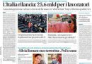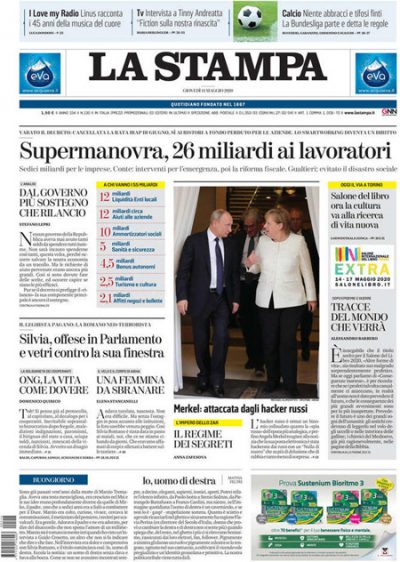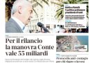 L’apertura di tutti i giornali di oggi è dedicata all’approvazione da parte del Consiglio dei ministri del testo del decreto “rilancio”, contenente misure per 55 miliardi di euro per sostenere la ripresa dell’economia e aiutare le famiglie per le conseguenze dell’epidemia da coronavirus (SARS-CoV-2), presentato ieri sera in una conferenza stampa dal presidente del Consiglio Conte.