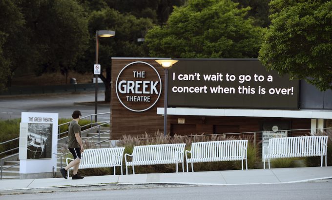 La scritta fuori dal Greek Theater di Los Angeles: «Non vedo l’ora di poter andare a un concerto quando sarà finita». (AP Photo/Chris Pizzello/Lapresse)