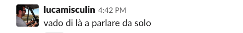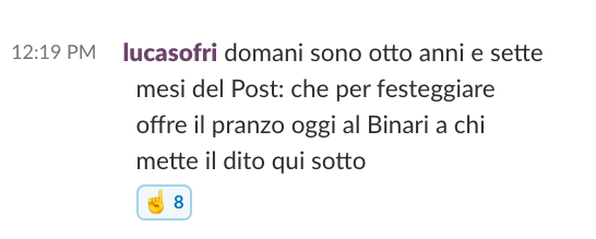 Visto che comunichiamo per lo più scrivendoci e quindi alziamo poco lo sguardo dai computer, tendiamo a usare le chat anche per qualche appunto di logistica.