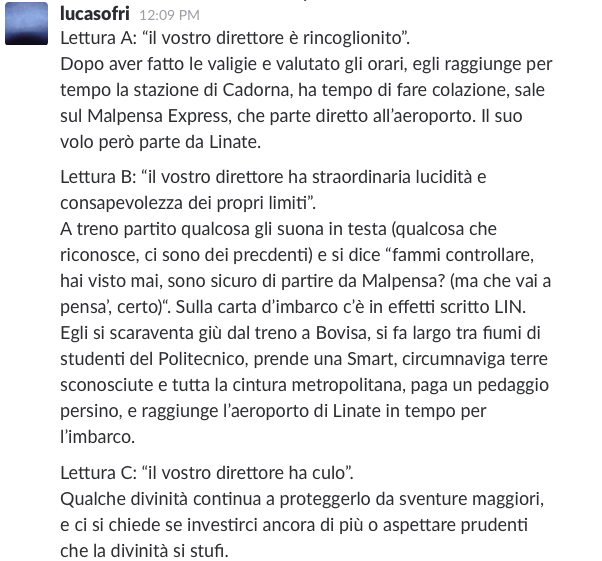 Avvertiamo se ci allontaniamo dal computer, se occupiamo la sala riunioni, se ci assentiamo per una telefonata o un’intervista, se andiamo a prendere un pacco che abbiamo ricevuto. Anche chi non è in redazione in quel momento riceve queste comunicazioni organizzative. Senza quel minimo di necessario contesto, lette da lontano a volte sono piuttosto singolari.
