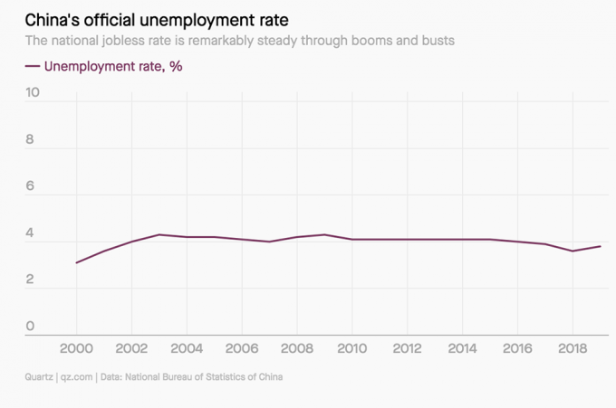 Dal 2002 al 2017 la disoccupazione in Cina è ufficialmente rimasta tra il 4,3 e il 3,9 per cento, subendo modifiche molto lievi anche durante la crisi finanziaria globale del 2008. Nel 2018 il metodo di calcolo è stato modificato per renderlo meno esclusivo e per comprendere, almeno in parte, anche i lavoratori migranti. Ma anche dopo la modifica i tassi sono rimasti sostanzialmente stabili, portando alcuni analisti a dichiarare che fossero dati «praticamente inutili».