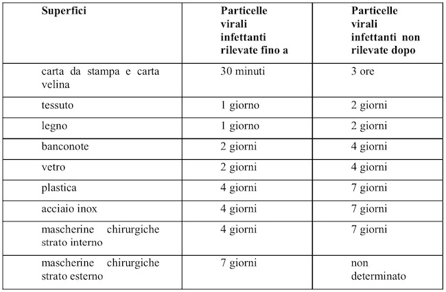 Sulla base delle conoscenze e degli esperimenti svolti finora, si può fare comunque qualche stima sulla permanenza del coronavirus in base alla tipologia di superficie. La tabella qui sotto mostra per quanto tempo è stata rilevata la presenza delle particelle infettanti del coronavirus e dopo quanto tempo non è stato più possibile rilevarle.