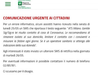 L’ATS di Milano ha inviato per sbaglio un SMS che avvisava alcune persone di essere state contatti di casi di coronavirus