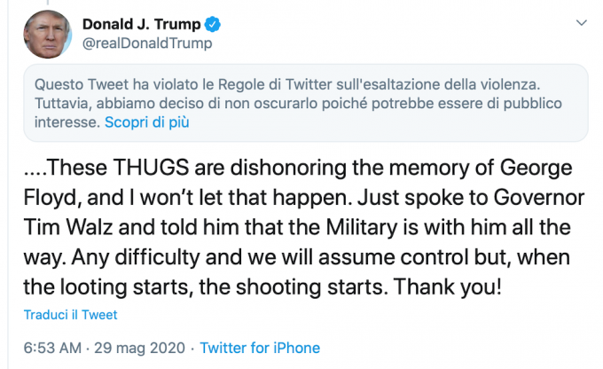 Twitter ha aggiunto un avviso prima del tweet, in cui è scritto che le parole di Trump violano le regole del social network sull’esaltazione della violenza, specificando però di aver deciso di non oscurarle perché “potrebbero essere di pubblico interesse”. Successivamente le stesse parole usate da Trump nel suo tweet sono state riprese anche dall’account della Casa Bianca: anche in questo caso Twitter ha segnalato il tweet con un avviso.