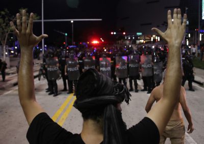 Anche le immagini che arrivano in questi giorni sono spesso violente: ci sono manifestanti feriti o con il viso bagnato di latte per placare gli effetti dei gas lacrimogeni, altri vengono tenuti a terra dalla polizia, altri ancora sollevano il pugno – simbolo delle lotte civili dei neri – sullo sfondo di vetrine in frantumi o edifici incendiati.