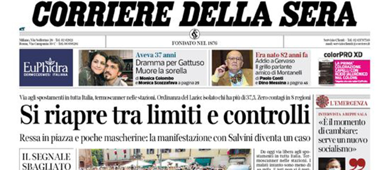 I giornali si occupano in apertura della riapertura da oggi alla circolazione delle persone fra le regioni italiane, delle celebrazioni per la festa della Repubblica, con la visita del presidente della Repubblica Mattarella a Codogno, e delle manifestazioni organizzate dal centrodestra a Roma per contestare il governo. La Stampa titola invece sul programma di riforme che dovrebbe essere presentato oggi dal presidente del Consiglio Conte.