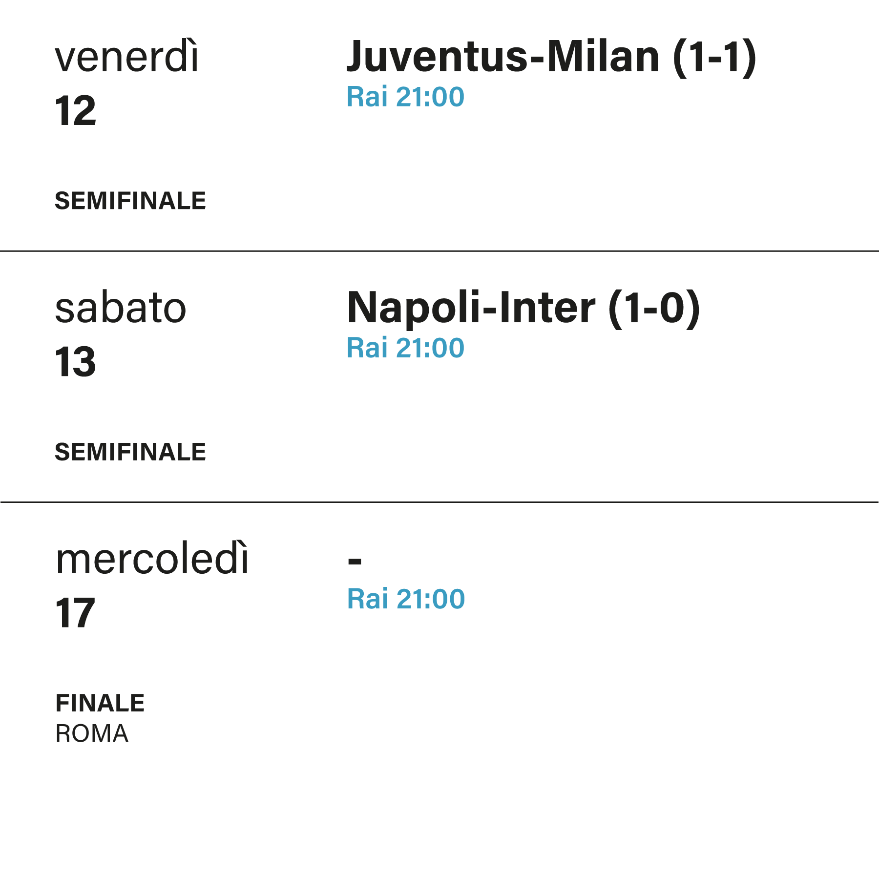Il calcio professionistico italiano riprenderà con le ultime tre partite di Coppa Italia in programma tra venerdì 12 e mercoledì 17 giugno. Venerdì sera Juventus e Milan si ritroveranno a Torino dopo il pareggio per 1-1 nell’andata giocata lo scorso 13 febbraio a San Siro. Il giorno seguente il Napoli potrà difendere in casa la vittoria per 1-0 ottenuta contro l’Inter a Milano il 12 febbraio. La finale si giocherà il mercoledì successivo allo Stadio Olimpico di Roma, evento in cui verrà anche presentata la nuova sponsorizzazione di Coca Cola. In caso di parità in queste tre partite si andrà direttamente ai calci di rigore: i tempi supplementari sono stati eliminati per risparmiare alle squadre minuti di gioco in vista della ripresa del campionato (qui il calendario di giugno). Con la finale del 17 giugno la Coppa Italia assegnerà il primo tra i maggiori trofei calcistici d’Europa dalla ripresa della stagione.