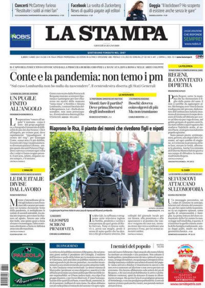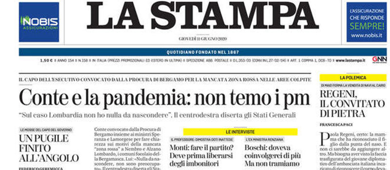 La maggior parte dei giornali di oggi segue in apertura la decisione della procura di Bergamo di convocare il presidente del Consiglio Conte e i ministri Lamorgese e Speranza per l’inchiesta sulla mancata istituzione della zona rossa nei comuni di Alzano Lombardo e Nembro. Altri titoli riguardano la decisione dei partiti di centrodestra di non partecipare agli “stati generali” per l’economia che inizieranno sabato, mentre Repubblica apre sulle difficoltà per la riapertura degli asili nido a settembre, il Sole 24 Ore si occupa dei posti di lavoro che si potrebbero perdere a causa della pandemia, e Avvenire titola sulle critiche della Conferenza Episcopale Italiana alla legge sull’omofobia in discussione alla Camera.